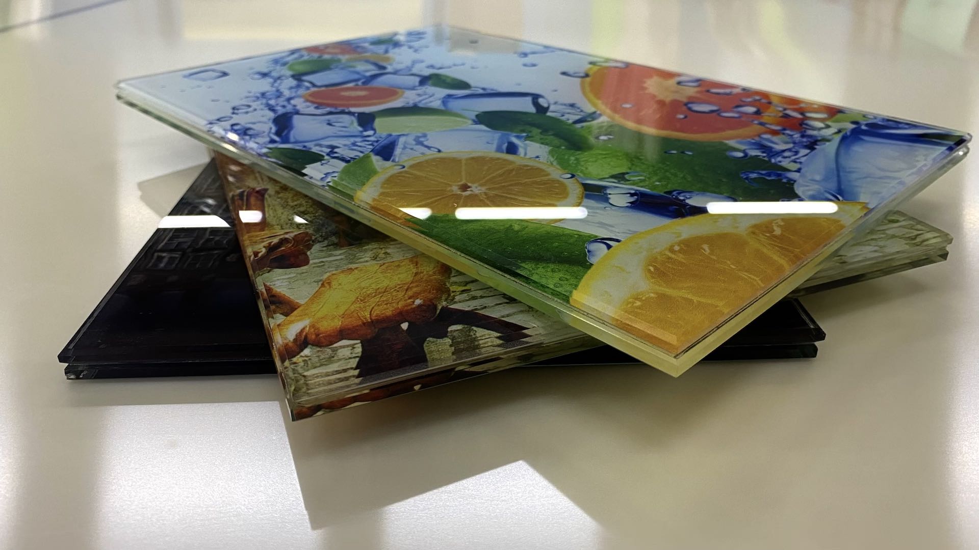 Особенностью ультрафиолетовой печати является ее универсальность при работе не только со стеклами различных типов, но и любыми другими плоскими поверхностями, такими как пленка, пластик, металл, или дерево. Эта технология также позволяет создавать многослойные и многотекстурные изображения, тем самым, добавляя дополнительную толщину и как результат трехмерность.