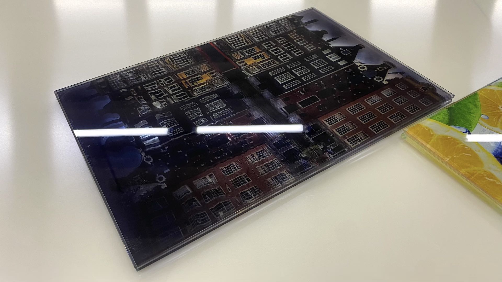 - Производство мебели. При производстве мебели УФ печать находит свое применение в шкафах-купе, кухонных гарнитурах, столах, столешницах и так далее. Если видите дома или в офисе яркую фотографию или фоновый рисунок на каком-то прозрачном материале, то с большой вероятностью это именно УФ печать. Даже для игрушек используют эту технологию. Например, развивающие азбуки из акрилового стекла.